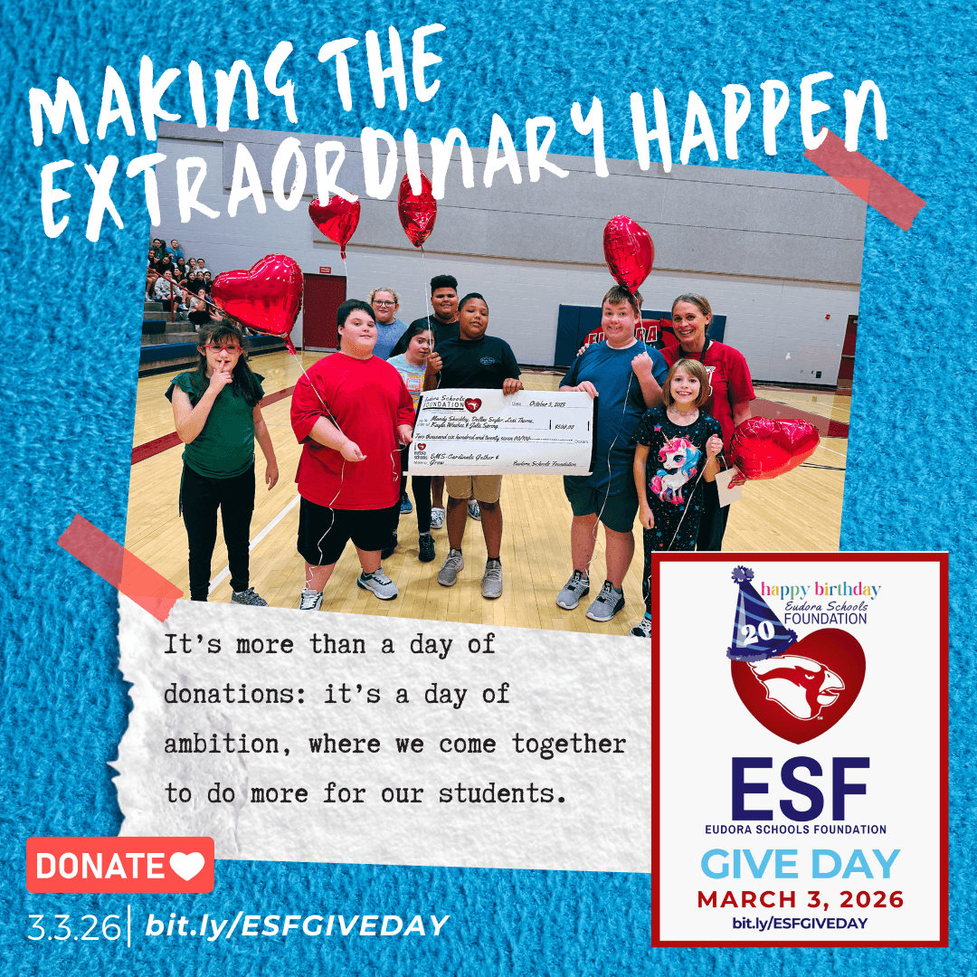 As ESF celebrates 20 years of investing in Eudora students, we’re setting a bold Give Day goal of $100,000 in 24 hours. Together, we can build on two decades of impact—fueling programs and resources that enrich learning, celebrate teacher innovation, and strengthen our schools. Every gift, no matter the size, helps create opportunities that last well beyond Give Day.
