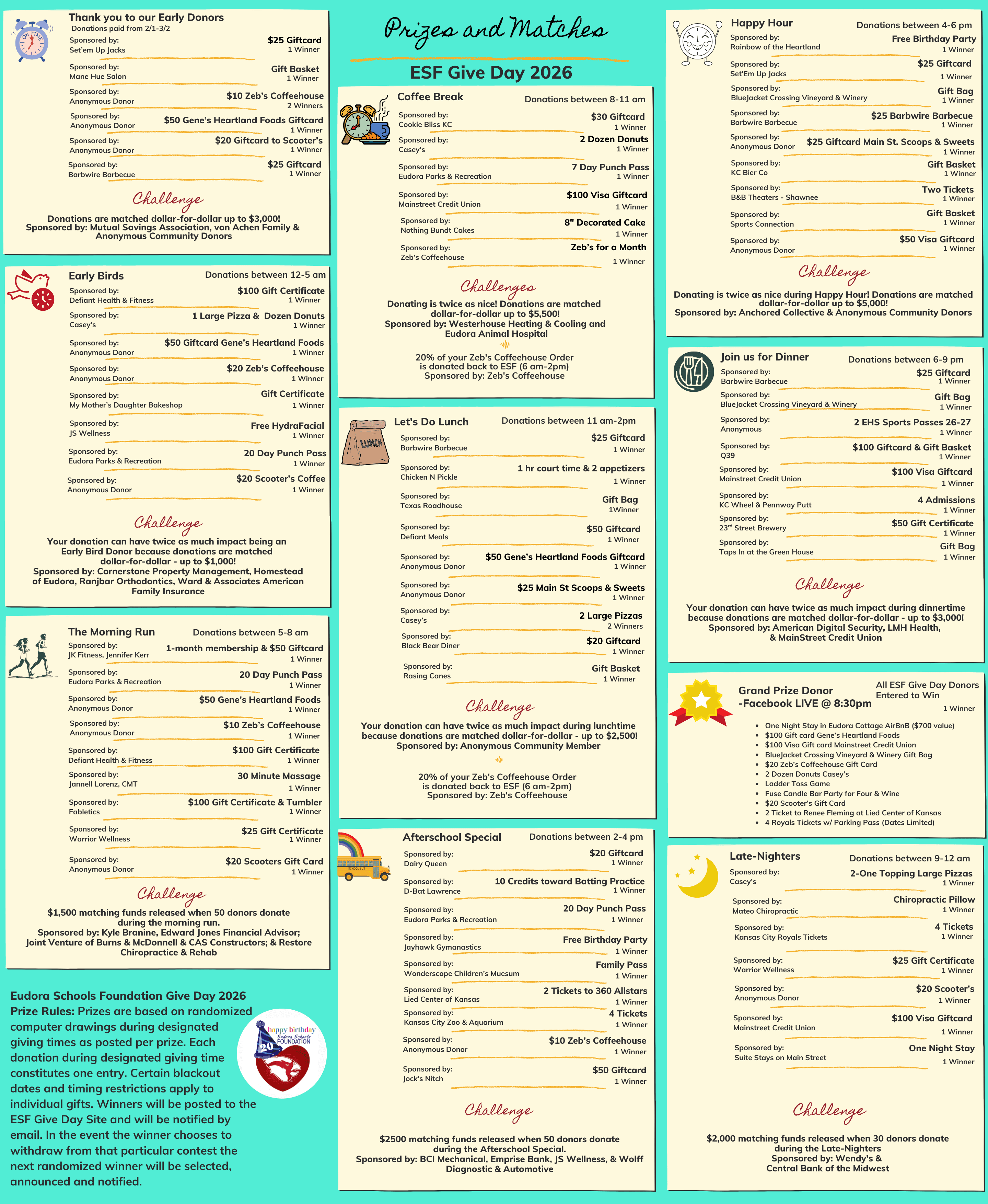 Eudora Schools Foundation Give Day 2026 Prize Rules: Prizes are based on randomized computer drawings during designated giving times as posted per prize. Each donation during designated giving time constitutes one entry. Certain blackout dates and timing restrictions apply to individual gifts. Winners will be posted to the ESF Give Day Site and will be notified by email. In the event the winner chooses to withdraw from that particular contest the next randomized winner will be selected, announced and notified.